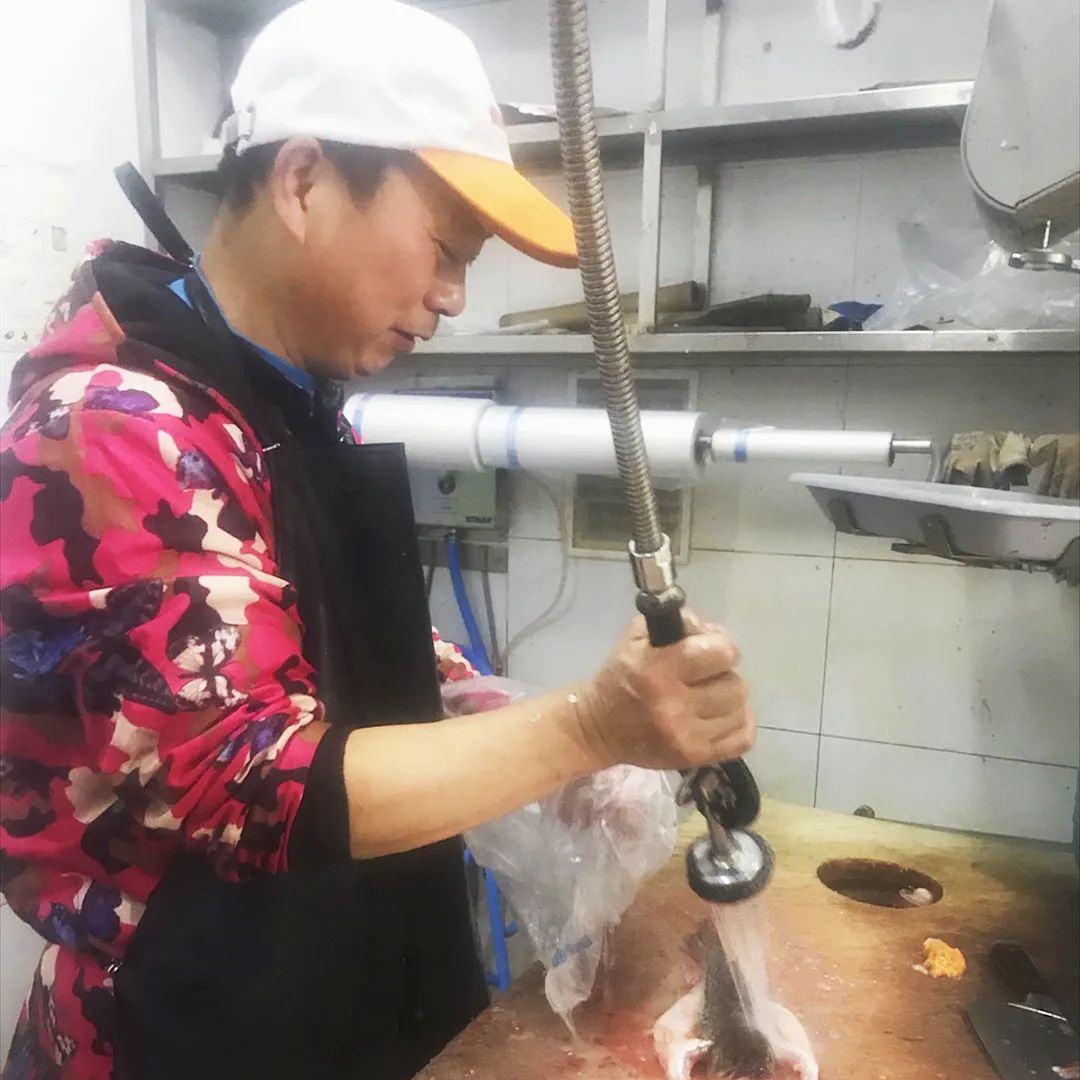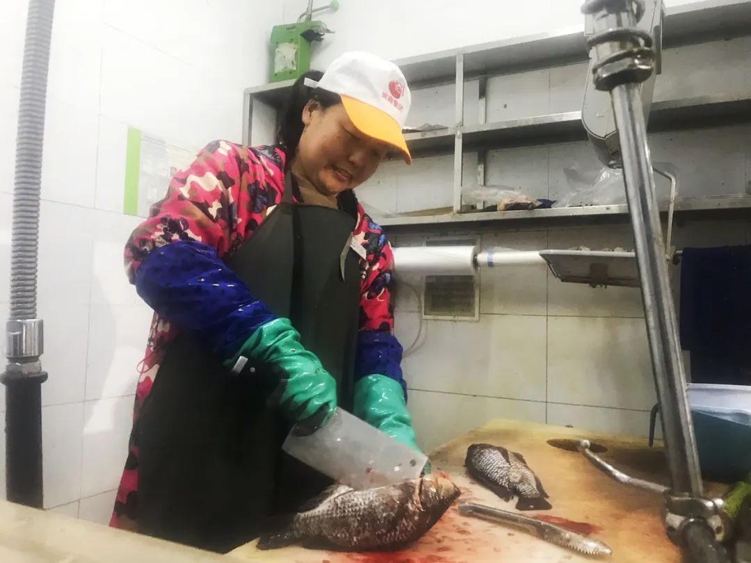 虽说来水产组只有半年时间,但上手很快,一学就会。完全看不出来只做半年的时间,俨然像个老师傅。入职第二天就能独当一面,一个人上中班,既能杀鱼又能打称,把所有的活儿都干得漂漂亮亮。